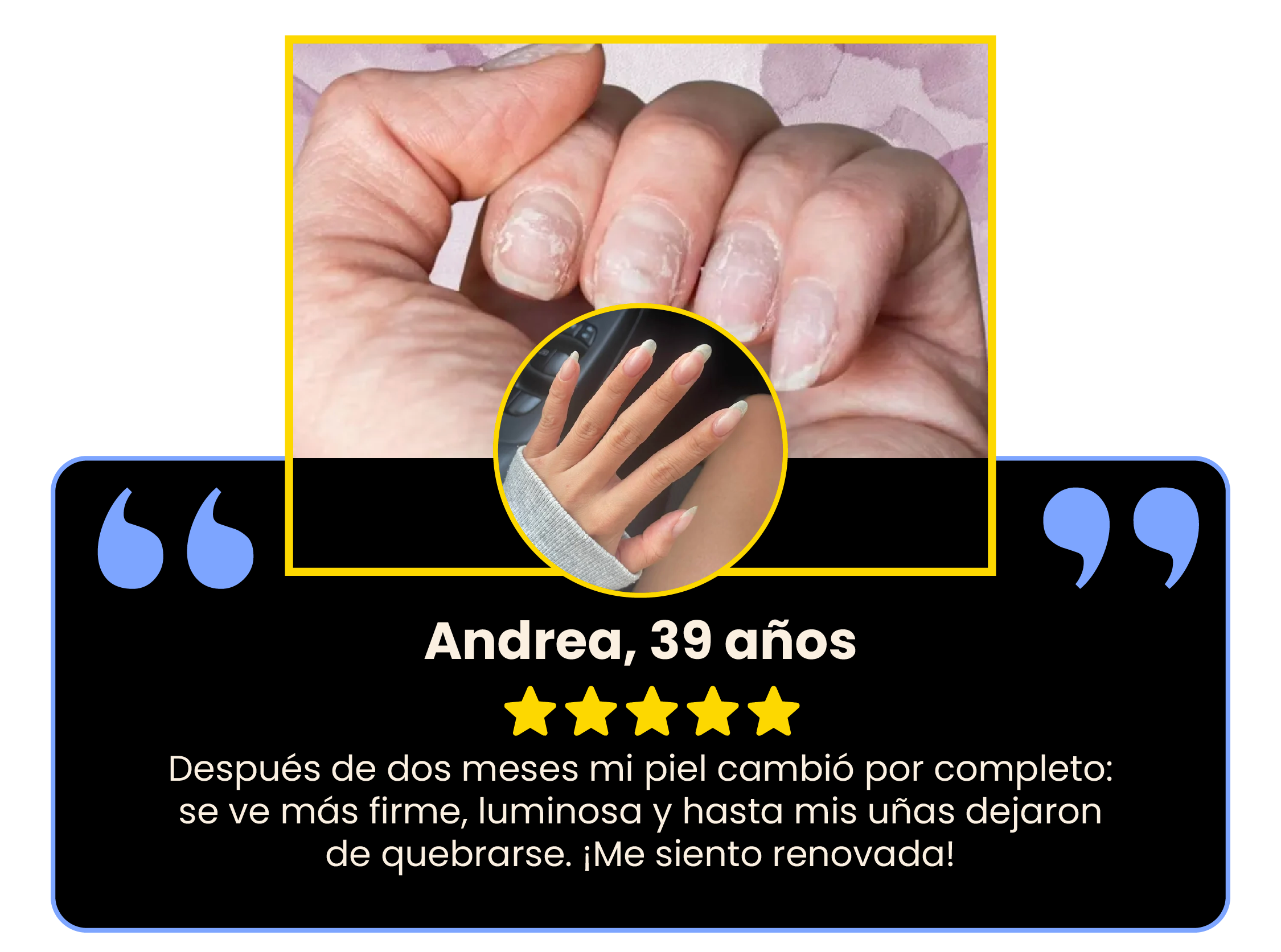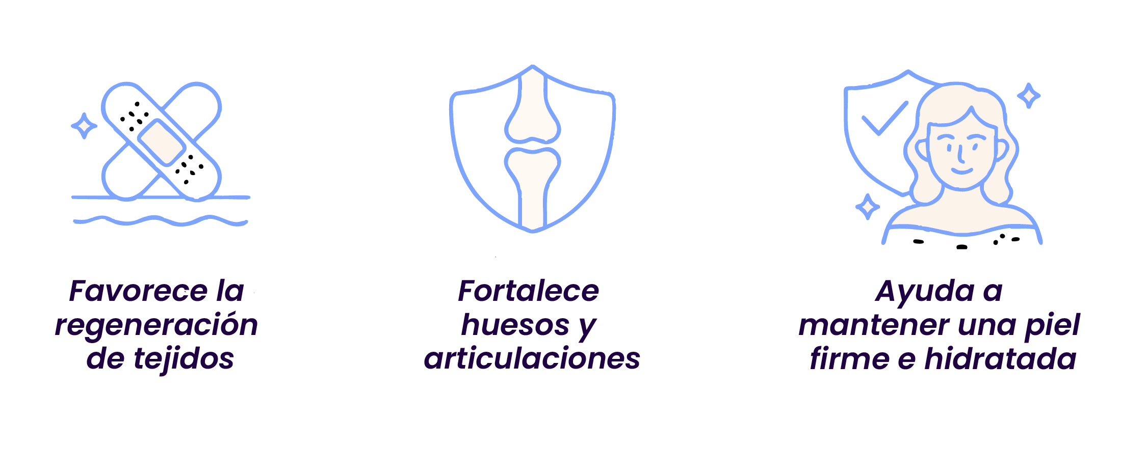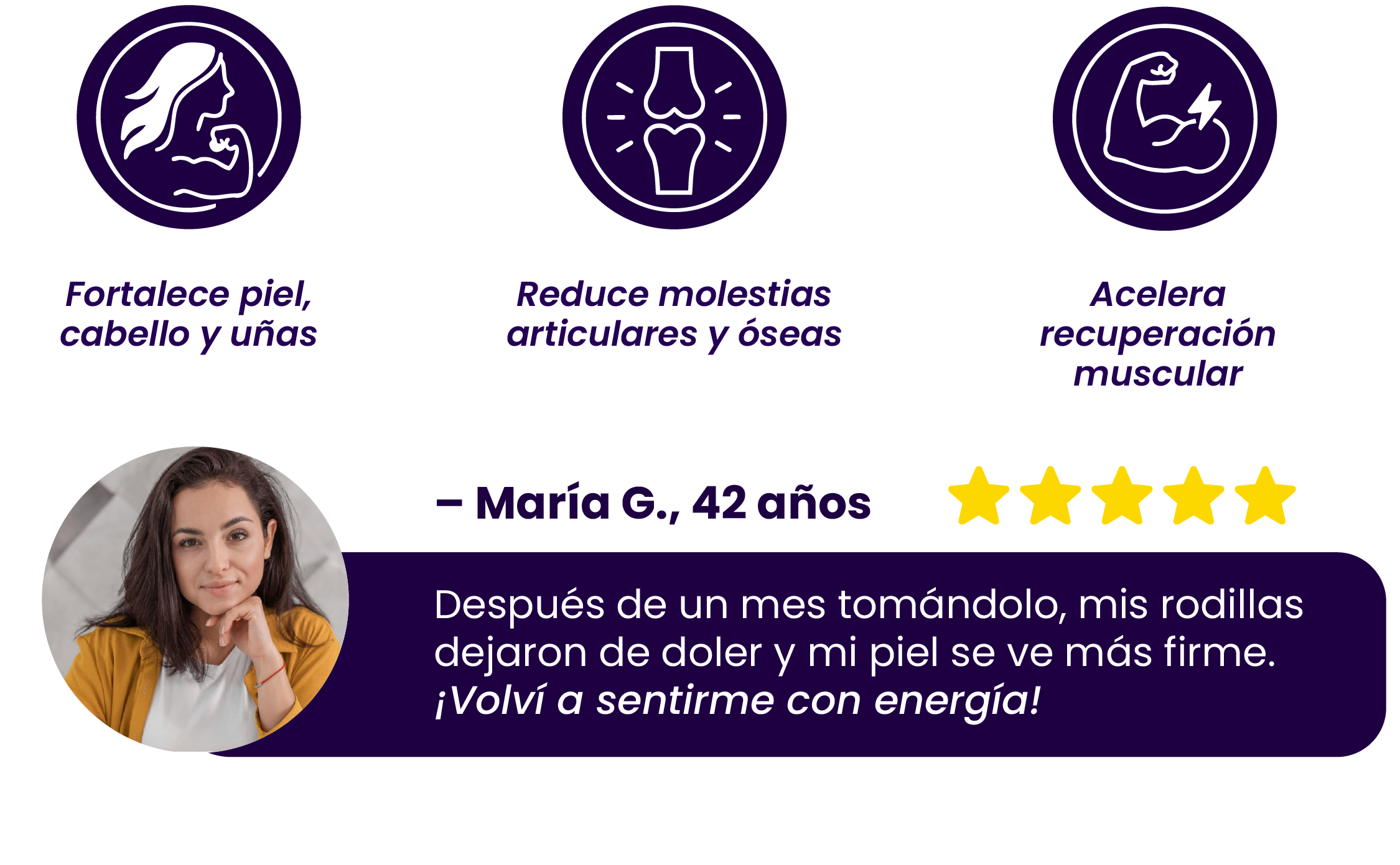 A partir de los 25 años tu cuerpo produce cada vez menos colágeno. Esa pérdida silenciosa se refleja en arrugas, cansancio, dolor en las articulaciones y una recuperación más lenta después del ejercicio. Con nuestra fórmula premium de 5 tipos de colágeno hidrolizado más vitamina C y ácido hialurónico, fortaleces desde hoy tu piel, huesos y músculos para envejecer sin dolor y con vitalidad.